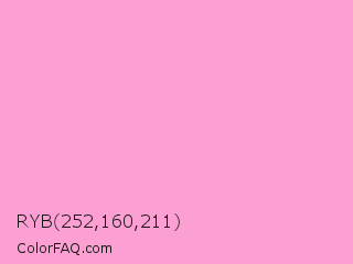 RYB 252,160,211 Color is a very light magenta color and the nearest color is Pale Magenta Pink #ff99cc. Hex code #fca0d3 and RGB value is rgb(252,160,211). In RGB color space, this color is composed of 99% red, 63% green, 83% blue, In CMYK color space, this color is composed of 0% cyan, 37% magenta, 16% yellow , 1% black , In HSL color space, this color has a hue angle of 327° , 94% saturation and 81% lightness.