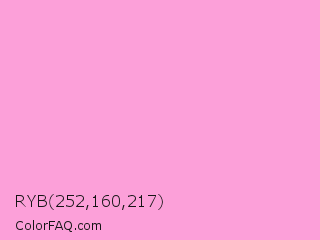RYB 252,160,217 Color is a very light magenta color and the nearest color is Lavender Rose #fba0e3. Hex code #fca0d9 and RGB value is rgb(252,160,217). In RGB color space, this color is composed of 99% red, 63% green, 85% blue, In CMYK color space, this color is composed of 0% cyan, 37% magenta, 14% yellow , 1% black , In HSL color space, this color has a hue angle of 323° , 94% saturation and 81% lightness.