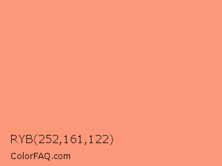 RYB 252,161,122 Color is a light red color and the nearest color is Vivid Tangerine #ff9980. Hex code #fc987a and RGB value is rgb(252,152,122). In RGB color space, this color is composed of 99% red, 60% green, 48% blue, In CMYK color space, this color is composed of 0% cyan, 40% magenta, 52% yellow , 1% black , In HSL color space, this color has a hue angle of 14° , 96% saturation and 73% lightness.