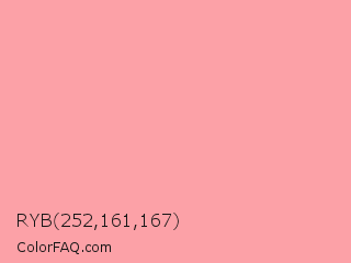 RYB 252,161,167 Color is a very light red color and the nearest color is Sweet Pink #fd9fa2. Hex code #fca1a7 and RGB value is rgb(252,161,167). In RGB color space, this color is composed of 99% red, 63% green, 65% blue, In CMYK color space, this color is composed of 0% cyan, 36% magenta, 34% yellow , 1% black , In HSL color space, this color has a hue angle of 356° , 94% saturation and 81% lightness.