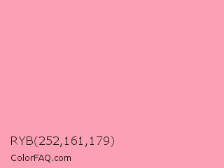 RYB 252,161,179 Color is a very light red color and the nearest color is Amaranth Pink #f19cbb. Hex code #fca1b3 and RGB value is rgb(252,161,179). In RGB color space, this color is composed of 99% red, 63% green, 70% blue, In CMYK color space, this color is composed of 0% cyan, 36% magenta, 29% yellow , 1% black , In HSL color space, this color has a hue angle of 348° , 94% saturation and 81% lightness.