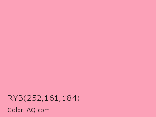 RYB 252,161,184 Color is a very light red color and the nearest color is Amaranth Pink #f19cbb. Hex code #fca1b8 and RGB value is rgb(252,161,184). In RGB color space, this color is composed of 99% red, 63% green, 72% blue, In CMYK color space, this color is composed of 0% cyan, 36% magenta, 27% yellow , 1% black , In HSL color space, this color has a hue angle of 345° , 94% saturation and 81% lightness.