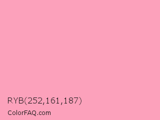 RYB 252,161,187 Color is a very light rose color and the nearest color is Amaranth Pink #f19cbb. Hex code #fca1bb and RGB value is rgb(252,161,187). In RGB color space, this color is composed of 99% red, 63% green, 73% blue, In CMYK color space, this color is composed of 0% cyan, 36% magenta, 26% yellow , 1% black , In HSL color space, this color has a hue angle of 343° , 94% saturation and 81% lightness.
