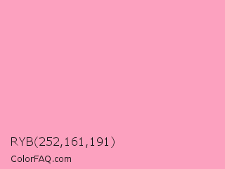 RYB 252,161,191 Color is a very light rose color and the nearest color is Pastel Magenta #f49ac2. Hex code #fca1bf and RGB value is rgb(252,161,191). In RGB color space, this color is composed of 99% red, 63% green, 75% blue, In CMYK color space, this color is composed of 0% cyan, 36% magenta, 24% yellow , 1% black , In HSL color space, this color has a hue angle of 340° , 94% saturation and 81% lightness.