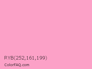 RYB 252,161,199 Color is a very light rose color and the nearest color is Carnation Pink #ffa6c9. Hex code #fca1c7 and RGB value is rgb(252,161,199). In RGB color space, this color is composed of 99% red, 63% green, 78% blue, In CMYK color space, this color is composed of 0% cyan, 36% magenta, 21% yellow , 1% black , In HSL color space, this color has a hue angle of 335° , 94% saturation and 81% lightness.