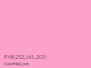 RYB 252,161,203 Color is a very light rose color and the nearest color is Carnation Pink #ffa6c9. Hex code #fca1cb and RGB value is rgb(252,161,203). In RGB color space, this color is composed of 99% red, 63% green, 80% blue, In CMYK color space, this color is composed of 0% cyan, 36% magenta, 19% yellow , 1% black , In HSL color space, this color has a hue angle of 332° , 94% saturation and 81% lightness.