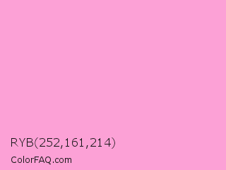RYB 252,161,214 Color is a very light magenta color and the nearest color is Lavender Rose #fba0e3. Hex code #fca1d6 and RGB value is rgb(252,161,214). In RGB color space, this color is composed of 99% red, 63% green, 84% blue, In CMYK color space, this color is composed of 0% cyan, 36% magenta, 15% yellow , 1% black , In HSL color space, this color has a hue angle of 325° , 94% saturation and 81% lightness.