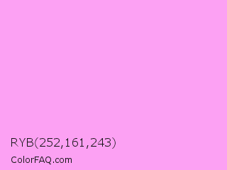 RYB 252,161,243 Color is a very light magenta color and the nearest color is Lavender Rose #fba0e3. Hex code #fca1f3 and RGB value is rgb(252,161,243). In RGB color space, this color is composed of 99% red, 63% green, 95% blue, In CMYK color space, this color is composed of 0% cyan, 36% magenta, 4% yellow , 1% black , In HSL color space, this color has a hue angle of 306° , 94% saturation and 81% lightness.
