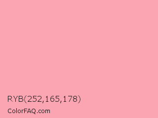 RYB 252,165,178 Color is a very light red color and the nearest color is Sundown #ffb1b3. Hex code #fca5b2 and RGB value is rgb(252,165,178). In RGB color space, this color is composed of 99% red, 65% green, 70% blue, In CMYK color space, this color is composed of 0% cyan, 35% magenta, 29% yellow , 1% black , In HSL color space, this color has a hue angle of 351° , 94% saturation and 82% lightness.