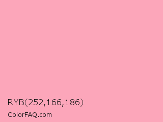 RYB 252,166,186 Color is a very light red color and the nearest color is Sundown #ffb1b3. Hex code #fca6ba and RGB value is rgb(252,166,186). In RGB color space, this color is composed of 99% red, 65% green, 73% blue, In CMYK color space, this color is composed of 0% cyan, 34% magenta, 26% yellow , 1% black , In HSL color space, this color has a hue angle of 346° , 93% saturation and 82% lightness.