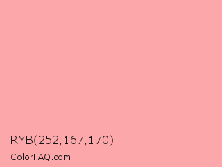 RYB 252,167,170 Color is a very light red color and the nearest color is Cornflower Lilac #ffb0ac. Hex code #fca7aa and RGB value is rgb(252,167,170). In RGB color space, this color is composed of 99% red, 65% green, 67% blue, In CMYK color space, this color is composed of 0% cyan, 34% magenta, 33% yellow , 1% black , In HSL color space, this color has a hue angle of 358° , 93% saturation and 82% lightness.