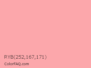 RYB 252,167,171 Color is a very light red color and the nearest color is Cornflower Lilac #ffb0ac. Hex code #fca7ab and RGB value is rgb(252,167,171). In RGB color space, this color is composed of 99% red, 65% green, 67% blue, In CMYK color space, this color is composed of 0% cyan, 34% magenta, 32% yellow , 1% black , In HSL color space, this color has a hue angle of 357° , 93% saturation and 82% lightness.