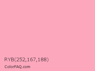 RYB 252,167,188 Color is a very light red color and the nearest color is Nadeshiko Pink #f6adc6. Hex code #fca7bc and RGB value is rgb(252,167,188). In RGB color space, this color is composed of 99% red, 65% green, 74% blue, In CMYK color space, this color is composed of 0% cyan, 34% magenta, 25% yellow , 1% black , In HSL color space, this color has a hue angle of 345° , 93% saturation and 82% lightness.