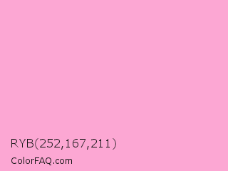 RYB 252,167,211 Color is a very light rose color and the nearest color is Lavender Pink #fbaed2. Hex code #fca7d3 and RGB value is rgb(252,167,211). In RGB color space, this color is composed of 99% red, 65% green, 83% blue, In CMYK color space, this color is composed of 0% cyan, 34% magenta, 16% yellow , 1% black , In HSL color space, this color has a hue angle of 329° , 93% saturation and 82% lightness.