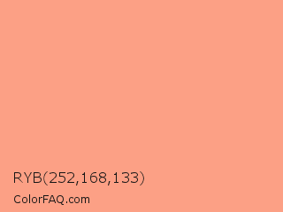 RYB 252,168,133 Color is a light red color and the nearest color is Vivid Tangerine #ffa089. Hex code #fca085 and RGB value is rgb(252,160,133). In RGB color space, this color is composed of 99% red, 63% green, 52% blue, In CMYK color space, this color is composed of 0% cyan, 37% magenta, 47% yellow , 1% black , In HSL color space, this color has a hue angle of 14° , 95% saturation and 75% lightness.