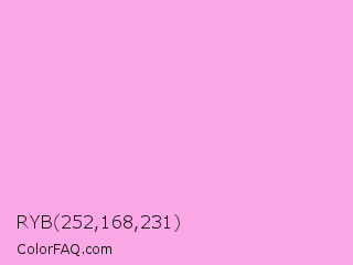 RYB 252,168,231 Color is a very light magenta color and the nearest color is Lavender Rose #fba0e3. Hex code #fca8e7 and RGB value is rgb(252,168,231). In RGB color space, this color is composed of 99% red, 66% green, 91% blue, In CMYK color space, this color is composed of 0% cyan, 33% magenta, 8% yellow , 1% black , In HSL color space, this color has a hue angle of 315° , 93% saturation and 82% lightness.