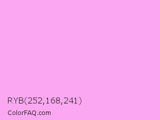 RYB 252,168,241 Color is a very light magenta color and the nearest color is Lavender Rose #fba0e3. Hex code #fca8f1 and RGB value is rgb(252,168,241). In RGB color space, this color is composed of 99% red, 66% green, 95% blue, In CMYK color space, this color is composed of 0% cyan, 33% magenta, 4% yellow , 1% black , In HSL color space, this color has a hue angle of 308° , 93% saturation and 82% lightness.