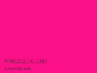 RYB 252,16,138 Color is a normal rose color and the nearest color is Fluorescent Pink #ff1493. Hex code #fc108a and RGB value is rgb(252,16,138). In RGB color space, this color is composed of 99% red, 6% green, 54% blue, In CMYK color space, this color is composed of 0% cyan, 94% magenta, 45% yellow , 1% black , In HSL color space, this color has a hue angle of 329° , 98% saturation and 53% lightness.