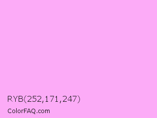 RYB 252,171,247 Color is a very light magenta color and the nearest color is Rich Brilliant Lavender #f1a7fe. Hex code #fcabf7 and RGB value is rgb(252,171,247). In RGB color space, this color is composed of 99% red, 67% green, 97% blue, In CMYK color space, this color is composed of 0% cyan, 32% magenta, 2% yellow , 1% black , In HSL color space, this color has a hue angle of 304° , 93% saturation and 83% lightness.
