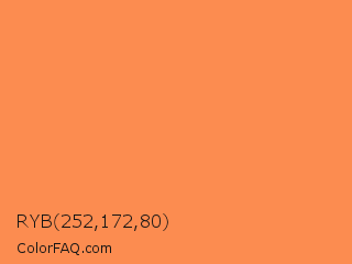 RYB 252,172,80 Color is a light orange color and the nearest color is Coral #ff7f50. Hex code #fc8c50 and RGB value is rgb(252,140,80). In RGB color space, this color is composed of 99% red, 55% green, 31% blue, In CMYK color space, this color is composed of 0% cyan, 44% magenta, 68% yellow , 1% black , In HSL color space, this color has a hue angle of 21° , 97% saturation and 65% lightness.