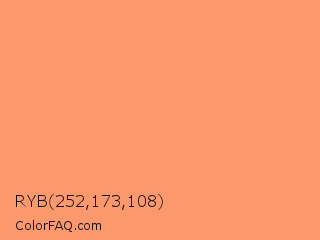 RYB 252,173,108 Color is a light orange color and the nearest color is Atomic Tangerine #ff9966. Hex code #fc996c and RGB value is rgb(252,153,108). In RGB color space, this color is composed of 99% red, 60% green, 42% blue, In CMYK color space, this color is composed of 0% cyan, 39% magenta, 57% yellow , 1% black , In HSL color space, this color has a hue angle of 19° , 96% saturation and 71% lightness.