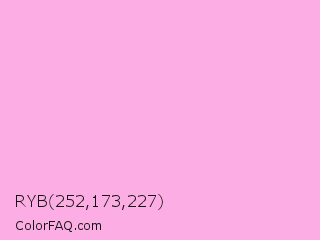 RYB 252,173,227 Color is a very light magenta color and the nearest color is Light Hot Pink #ffb3de. Hex code #fcade3 and RGB value is rgb(252,173,227). In RGB color space, this color is composed of 99% red, 68% green, 89% blue, In CMYK color space, this color is composed of 0% cyan, 31% magenta, 10% yellow , 1% black , In HSL color space, this color has a hue angle of 319° , 93% saturation and 83% lightness.