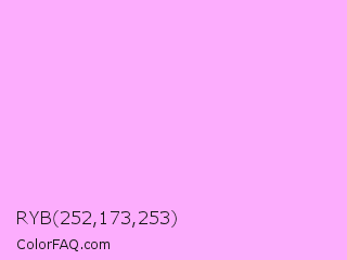 RYB 252,173,253 Color is a very light magenta color and the nearest color is Rich Brilliant Lavender #f1a7fe. Hex code #fcadfd and RGB value is rgb(252,173,253). In RGB color space, this color is composed of 99% red, 68% green, 99% blue, In CMYK color space, this color is composed of 0% cyan, 32% magenta, 0% yellow , 1% black , In HSL color space, this color has a hue angle of 299° , 95% saturation and 84% lightness.