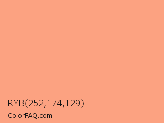 RYB 252,174,129 Color is a light orange color and the nearest color is Light Salmon #ffa07a. Hex code #fca281 and RGB value is rgb(252,162,129). In RGB color space, this color is composed of 99% red, 64% green, 51% blue, In CMYK color space, this color is composed of 0% cyan, 36% magenta, 49% yellow , 1% black , In HSL color space, this color has a hue angle of 16° , 95% saturation and 75% lightness.