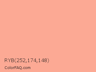 RYB 252,174,148 Color is a light red color and the nearest color is Mona Lisa #ffa194. Hex code #fca994 and RGB value is rgb(252,169,148). In RGB color space, this color is composed of 99% red, 66% green, 58% blue, In CMYK color space, this color is composed of 0% cyan, 33% magenta, 41% yellow , 1% black , In HSL color space, this color has a hue angle of 12° , 95% saturation and 78% lightness.