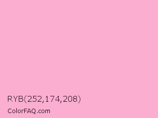RYB 252,174,208 Color is a very light rose color and the nearest color is Lavender Pink #fbaed2. Hex code #fcaed0 and RGB value is rgb(252,174,208). In RGB color space, this color is composed of 99% red, 68% green, 82% blue, In CMYK color space, this color is composed of 0% cyan, 31% magenta, 17% yellow , 1% black , In HSL color space, this color has a hue angle of 334° , 93% saturation and 84% lightness.