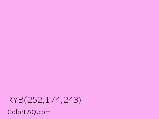 RYB 252,174,243 Color is a very light magenta color and the nearest color is Rich Brilliant Lavender #f1a7fe. Hex code #fcaef3 and RGB value is rgb(252,174,243). In RGB color space, this color is composed of 99% red, 68% green, 95% blue, In CMYK color space, this color is composed of 0% cyan, 31% magenta, 4% yellow , 1% black , In HSL color space, this color has a hue angle of 307° , 93% saturation and 84% lightness.