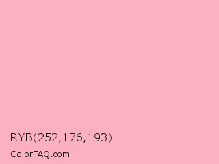 RYB 252,176,193 Color is a very light red color and the nearest color is Light Pink #ffb6c1. Hex code #fcb0c1 and RGB value is rgb(252,176,193). In RGB color space, this color is composed of 99% red, 69% green, 76% blue, In CMYK color space, this color is composed of 0% cyan, 30% magenta, 23% yellow , 1% black , In HSL color space, this color has a hue angle of 347° , 93% saturation and 84% lightness.
