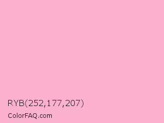 RYB 252,177,207 Color is a very light rose color and the nearest color is Lavender Pink #fbaed2. Hex code #fcb1cf and RGB value is rgb(252,177,207). In RGB color space, this color is composed of 99% red, 69% green, 81% blue, In CMYK color space, this color is composed of 0% cyan, 30% magenta, 18% yellow , 1% black , In HSL color space, this color has a hue angle of 336° , 93% saturation and 84% lightness.