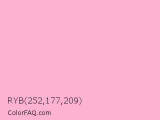 RYB 252,177,209 Color is a very light rose color and the nearest color is Lavender Pink #fbaed2. Hex code #fcb1d1 and RGB value is rgb(252,177,209). In RGB color space, this color is composed of 99% red, 69% green, 82% blue, In CMYK color space, this color is composed of 0% cyan, 30% magenta, 17% yellow , 1% black , In HSL color space, this color has a hue angle of 334° , 93% saturation and 84% lightness.
