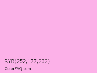 RYB 252,177,232 Color is a very light magenta color and the nearest color is Light Hot Pink #ffb3de. Hex code #fcb1e8 and RGB value is rgb(252,177,232). In RGB color space, this color is composed of 99% red, 69% green, 91% blue, In CMYK color space, this color is composed of 0% cyan, 30% magenta, 8% yellow , 1% black , In HSL color space, this color has a hue angle of 316° , 93% saturation and 84% lightness.