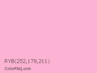 RYB 252,179,211 Color is a very light rose color and the nearest color is Lavender Pink #fbaed2. Hex code #fcb3d3 and RGB value is rgb(252,179,211). In RGB color space, this color is composed of 99% red, 70% green, 83% blue, In CMYK color space, this color is composed of 0% cyan, 29% magenta, 16% yellow , 1% black , In HSL color space, this color has a hue angle of 334° , 92% saturation and 85% lightness.