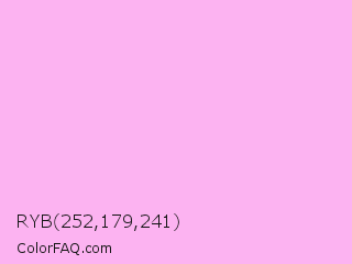 RYB 252,179,241 Color is a very light magenta color and the nearest color is Electric Lavender #f4bbff. Hex code #fcb3f1 and RGB value is rgb(252,179,241). In RGB color space, this color is composed of 99% red, 70% green, 95% blue, In CMYK color space, this color is composed of 0% cyan, 29% magenta, 4% yellow , 1% black , In HSL color space, this color has a hue angle of 309° , 92% saturation and 85% lightness.