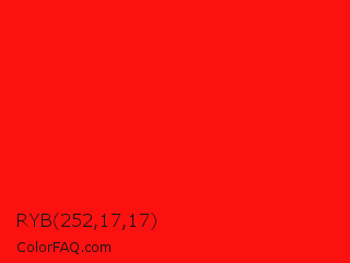 RYB 252,17,17 Color is a normal red color and the nearest color is Vivid Red #f70d1a. Hex code #fc1111 and RGB value is rgb(252,17,17). In RGB color space, this color is composed of 99% red, 7% green, 7% blue, In CMYK color space, this color is composed of 0% cyan, 93% magenta, 93% yellow , 1% black , In HSL color space, this color has a hue angle of 0° , 98% saturation and 53% lightness.