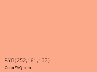 RYB 252,181,137 Color is a light orange color and the nearest color is Hit Pink #ffab81. Hex code #fca989 and RGB value is rgb(252,169,137). In RGB color space, this color is composed of 99% red, 66% green, 54% blue, In CMYK color space, this color is composed of 0% cyan, 33% magenta, 46% yellow , 1% black , In HSL color space, this color has a hue angle of 17° , 95% saturation and 76% lightness.