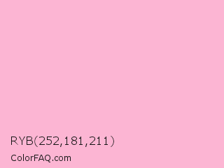 RYB 252,181,211 Color is a very light rose color and the nearest color is Cotton Candy #ffb7d5. Hex code #fcb5d3 and RGB value is rgb(252,181,211). In RGB color space, this color is composed of 99% red, 71% green, 83% blue, In CMYK color space, this color is composed of 0% cyan, 28% magenta, 16% yellow , 1% black , In HSL color space, this color has a hue angle of 335° , 92% saturation and 85% lightness.