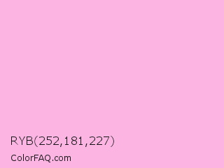 RYB 252,181,227 Color is a very light magenta color and the nearest color is Light Hot Pink #ffb3de. Hex code #fcb5e3 and RGB value is rgb(252,181,227). In RGB color space, this color is composed of 99% red, 71% green, 89% blue, In CMYK color space, this color is composed of 0% cyan, 28% magenta, 10% yellow , 1% black , In HSL color space, this color has a hue angle of 321° , 92% saturation and 85% lightness.