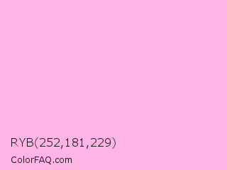 RYB 252,181,229 Color is a very light magenta color and the nearest color is Light Hot Pink #ffb3de. Hex code #fcb5e5 and RGB value is rgb(252,181,229). In RGB color space, this color is composed of 99% red, 71% green, 90% blue, In CMYK color space, this color is composed of 0% cyan, 28% magenta, 9% yellow , 1% black , In HSL color space, this color has a hue angle of 319° , 92% saturation and 85% lightness.