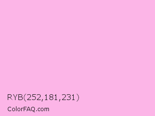 RYB 252,181,231 Color is a very light magenta color and the nearest color is Light Hot Pink #ffb3de. Hex code #fcb5e7 and RGB value is rgb(252,181,231). In RGB color space, this color is composed of 99% red, 71% green, 91% blue, In CMYK color space, this color is composed of 0% cyan, 28% magenta, 8% yellow , 1% black , In HSL color space, this color has a hue angle of 318° , 92% saturation and 85% lightness.