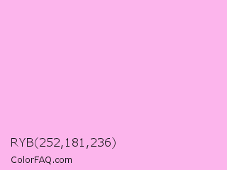 RYB 252,181,236 Color is a very light magenta color and the nearest color is Light Hot Pink #ffb3de. Hex code #fcb5ec and RGB value is rgb(252,181,236). In RGB color space, this color is composed of 99% red, 71% green, 93% blue, In CMYK color space, this color is composed of 0% cyan, 28% magenta, 6% yellow , 1% black , In HSL color space, this color has a hue angle of 314° , 92% saturation and 85% lightness.