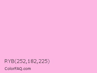 RYB 252,182,225 Color is a very light magenta color and the nearest color is Light Hot Pink #ffb3de. Hex code #fcb6e1 and RGB value is rgb(252,182,225). In RGB color space, this color is composed of 99% red, 71% green, 88% blue, In CMYK color space, this color is composed of 0% cyan, 28% magenta, 11% yellow , 1% black , In HSL color space, this color has a hue angle of 323° , 92% saturation and 85% lightness.