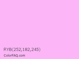 RYB 252,182,245 Color is a very light magenta color and the nearest color is Electric Lavender #f4bbff. Hex code #fcb6f5 and RGB value is rgb(252,182,245). In RGB color space, this color is composed of 99% red, 71% green, 96% blue, In CMYK color space, this color is composed of 0% cyan, 28% magenta, 3% yellow , 1% black , In HSL color space, this color has a hue angle of 306° , 92% saturation and 85% lightness.