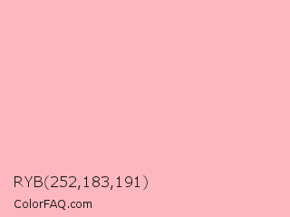 RYB 252,183,191 Color is a very light red color and the nearest color is Light Pink #ffb6c1. Hex code #fcb7bf and RGB value is rgb(252,183,191). In RGB color space, this color is composed of 99% red, 72% green, 75% blue, In CMYK color space, this color is composed of 0% cyan, 27% magenta, 24% yellow , 1% black , In HSL color space, this color has a hue angle of 353° , 92% saturation and 85% lightness.