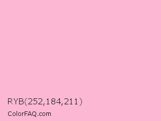 RYB 252,184,211 Color is a very light rose color and the nearest color is Cotton Candy #ffb7d5. Hex code #fcb8d3 and RGB value is rgb(252,184,211). In RGB color space, this color is composed of 99% red, 72% green, 83% blue, In CMYK color space, this color is composed of 0% cyan, 27% magenta, 16% yellow , 1% black , In HSL color space, this color has a hue angle of 336° , 92% saturation and 85% lightness.