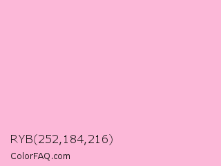 RYB 252,184,216 Color is a very light rose color and the nearest color is Cotton Candy #ffb7d5. Hex code #fcb8d8 and RGB value is rgb(252,184,216). In RGB color space, this color is composed of 99% red, 72% green, 85% blue, In CMYK color space, this color is composed of 0% cyan, 27% magenta, 14% yellow , 1% black , In HSL color space, this color has a hue angle of 332° , 92% saturation and 85% lightness.