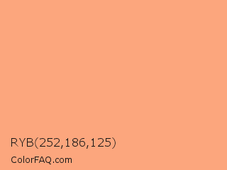RYB 252,186,125 Color is a light orange color and the nearest color is Hit Pink #ffab81. Hex code #fca67d and RGB value is rgb(252,166,125). In RGB color space, this color is composed of 99% red, 65% green, 49% blue, In CMYK color space, this color is composed of 0% cyan, 34% magenta, 50% yellow , 1% black , In HSL color space, this color has a hue angle of 19° , 95% saturation and 74% lightness.